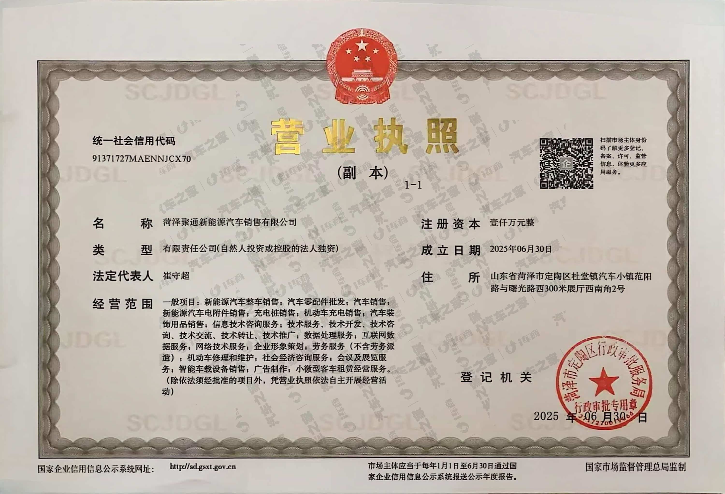 菏泽聚通新能源汽车销售有限公司成立于2025-06-30,法定代表人为崔守超,注册资本为1000万元,统一社会信用代码为91371727MAENNJCX70,企业注册地址位于山东省菏泽市定陶区杜堂镇汽车小镇范阳路与曙光路西300米展厅西南角2号,所属行业为批发业,经营范围包含:一般项目:新能源汽车整车销售;汽车零配件批发;汽车销售;新能源汽车电附件销售;充电桩销售;机动车充电销售;汽车装饰用品销售;信息技术咨询服务;技术服务、技术开发、技术咨询、技术交流、技术转让、技术推广;数据处理服务;互联网数据服务;网络技术服务;企业形象策划;劳务服务(不含劳务派遣);机动车修理和维护;社会经济咨询服务;会议及展览服务;智能车载设备销售;广告制作;小微型客车租赁经营服务。(除依法须经批准的项目外,凭营业执照依法自主开展经营活动)。企业当前经营状态为存续。