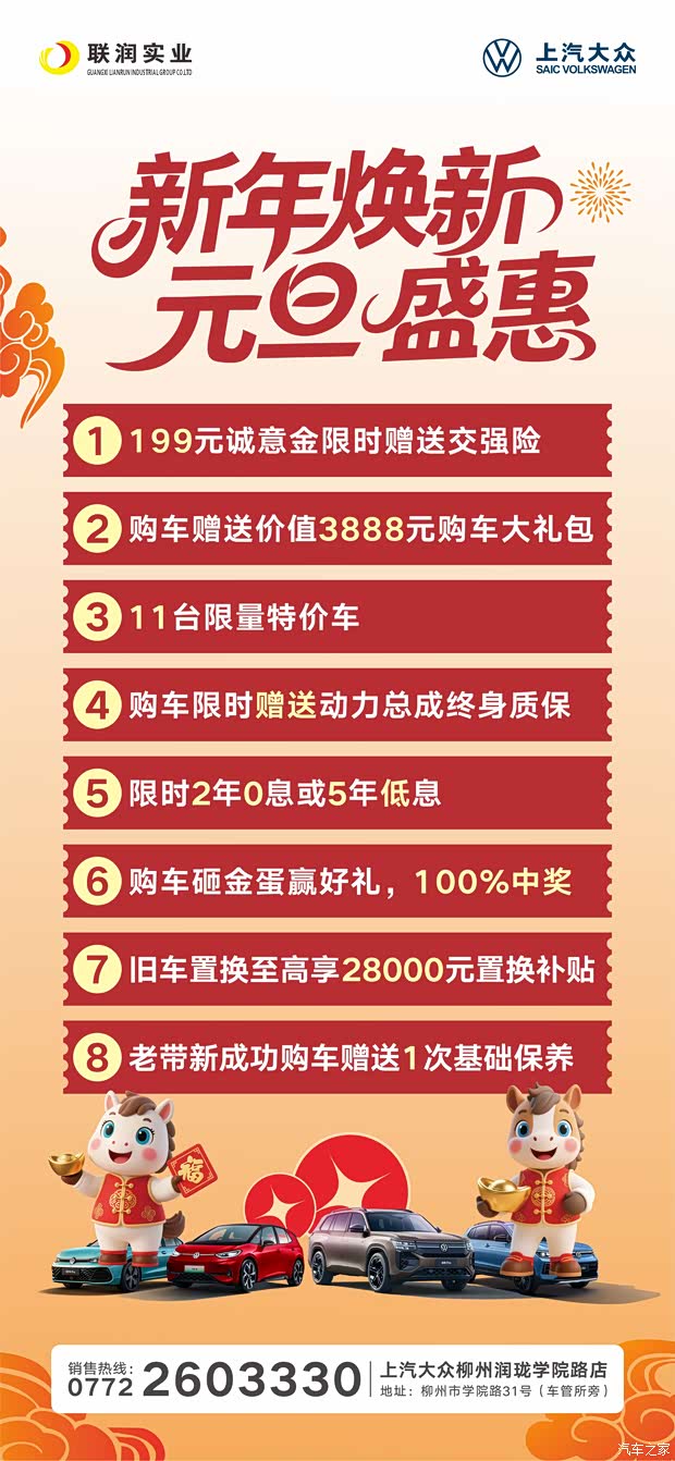 活动提供199元诚意金送交强险、3888元购车大礼包等八重好礼。还有11台特价车、动力总成终身质保等优惠。