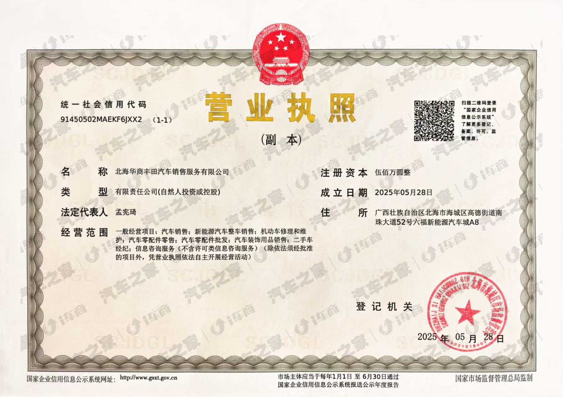 北海华商一汽丰田店,拥有一批业务精通的销售人员及经验丰富,技术精良的售后服务人员,售后服务设备先进、齐全。“客户至上"是我们的服务宗旨,"客户满意度"是我们工作的指导思想。公司宽敞明亮的展厅环境,透明安静的办公秩序,先进高效的维修设备,专业贴心的服务水准,将为客户带来全新的服务体验