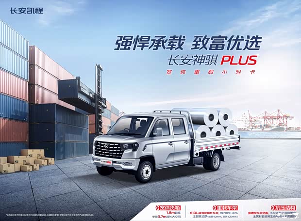 “宽体重载小轻卡”——长安神骐PLUS,是一台创富型商用车,以重载车架、宽体货箱、抗压结构全方位PLUS升级,满足消费者的多元化用车需求!