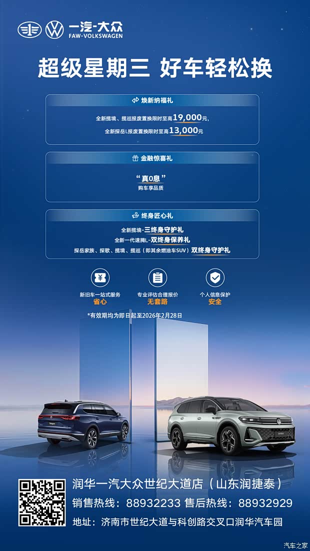 近期车主群里,这份周三专属的换车惊喜持续刷屏!一汽大众每周三【超级星期三】置换专场,正掀起一场旧车换新风暴—超高额置换补贴+一站式省心服务,让众多车主慕名到店,排队换新,今天就为你彻底解密,这场爆款置换活动背后的多重惊喜福利!
