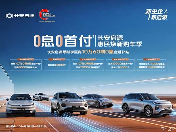 春启万象,钜惠登场,全新Q05 推出春季限时购车福利,405 Air 车型仅需6.99万元!标配宁德时代电芯+舒适大空间+405续航,日常通勤出游都能满足,同级别、同配置、同品质下属于前所未有的低价,6.99万直接闭眼入!而且此价格没有限制购车条件!全国可享!没有套路!价格击穿底线,价值碾压同级,买入门纯电SUV,必看长安启源全新Q05!活动时间jinxin2026年3月1日至3月31日,到期后将立即恢复原价。