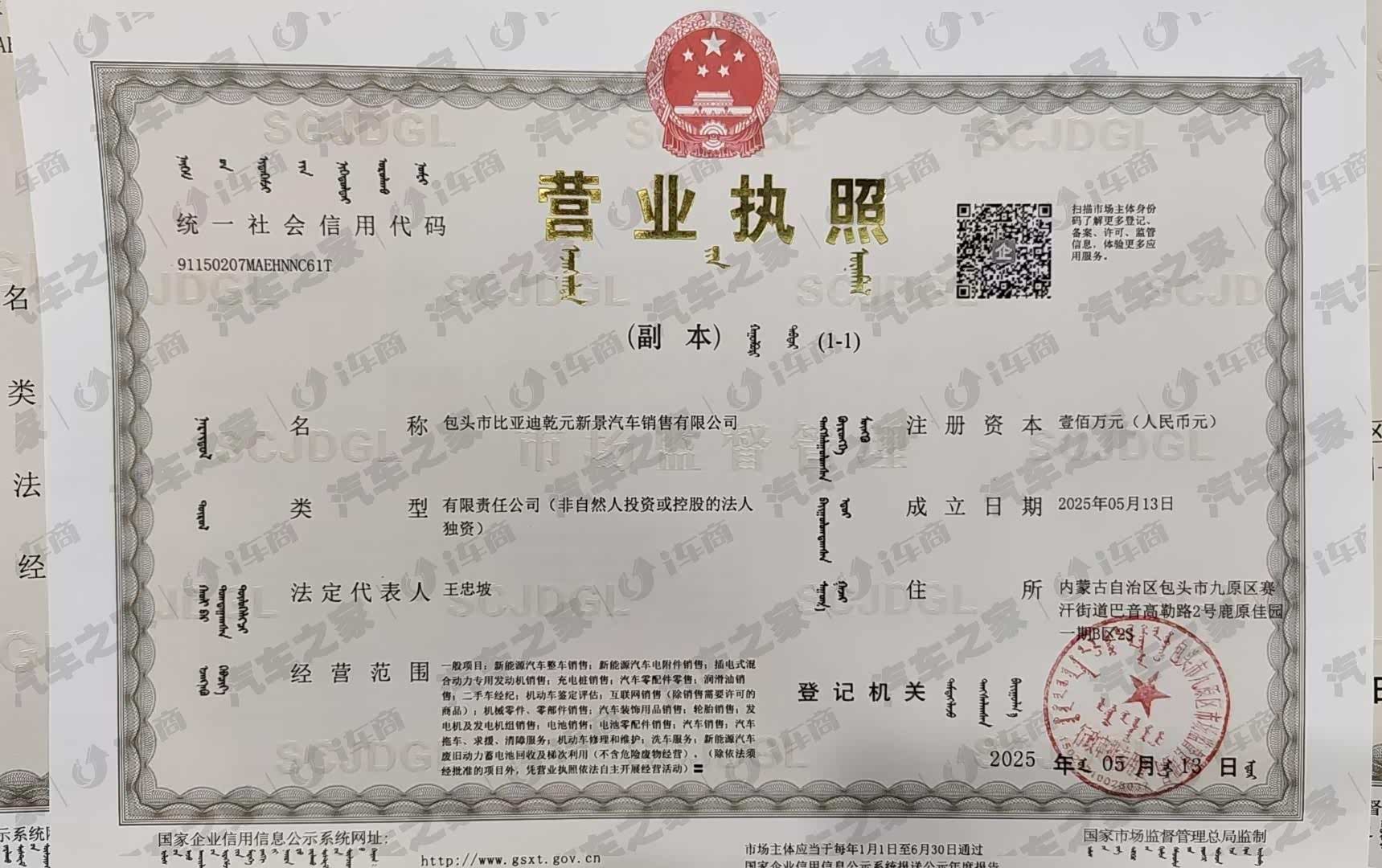 包头市比亚迪乾元新景汽车销售有限公司