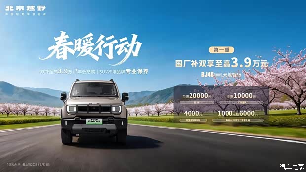 春风拂野,万物焕新。正值春日出行黄金季,北京越野重磅启动春暖行动,推出三重礼遇:国厂补双享至高3.9万、7年低息购、SUV不限品牌专业保养三折,涵盖BJ30旅行家、BJ40增程、BJ40燃油和BJ40探险家等多款车型,用实打实的福利优惠和全方位的服务保障,让更多消费者轻松拥抱美好出行生活。