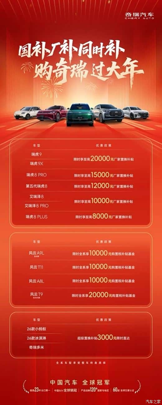 新年购车旺季,奇瑞汽车精准把握市场需求,重磅推出覆盖全品类车型的厂补政策,叠加国家补贴红利,构建起“双重补贴+全维保障”的购车优惠体系,为消费者献上新春购车厚礼。其中,艾瑞泽8家族专属至高1万元厂补的重磅福利,成为此次政策的核心亮点之一,尽显品牌对消费者的诚意。