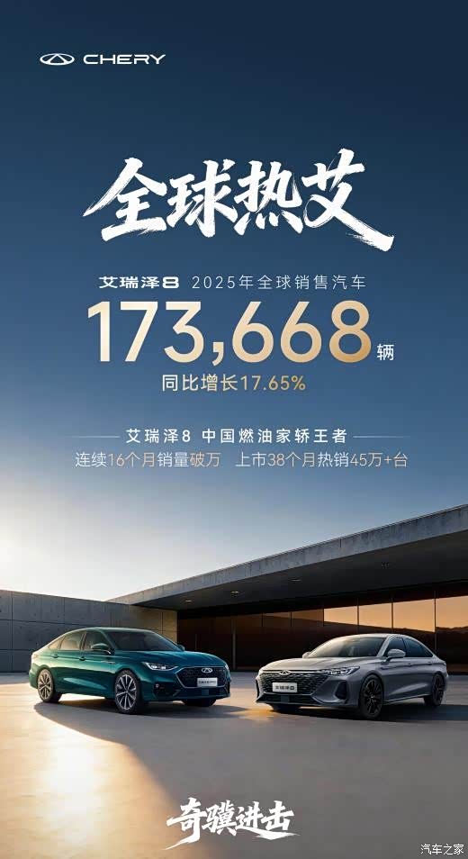 2025年,艾瑞泽8家族以全球销量173668辆、同比劲增17.65%的硬核战绩圆满收官;自上市以来,家族38个月累计销量突破45万辆,更创下连续16个月销量破万的行业佳绩,在竞争激烈的市场红海稳立潮头。艾瑞泽8家族的成功并非偶然,在同质化竞争激烈的家轿市场,家族通过艾瑞泽8与艾瑞泽8 PRO双线布局,全面覆盖家庭实用、运动性能等多元化需求,持续吸引年轻消费群体。这种快速响应市场的进化能力与精准的市场布局,正是其赢得全球用户青睐的关键所在。