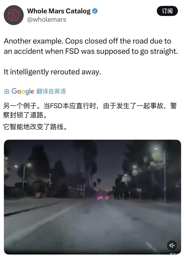 一个真实案例:车辆正用智能辅助驾驶行驶,前方道路因事故被警察临时封闭。系统没有死板地继续前进或报错,而是准确识别出封路状态,随即主动重新规划路线,智能绕行。