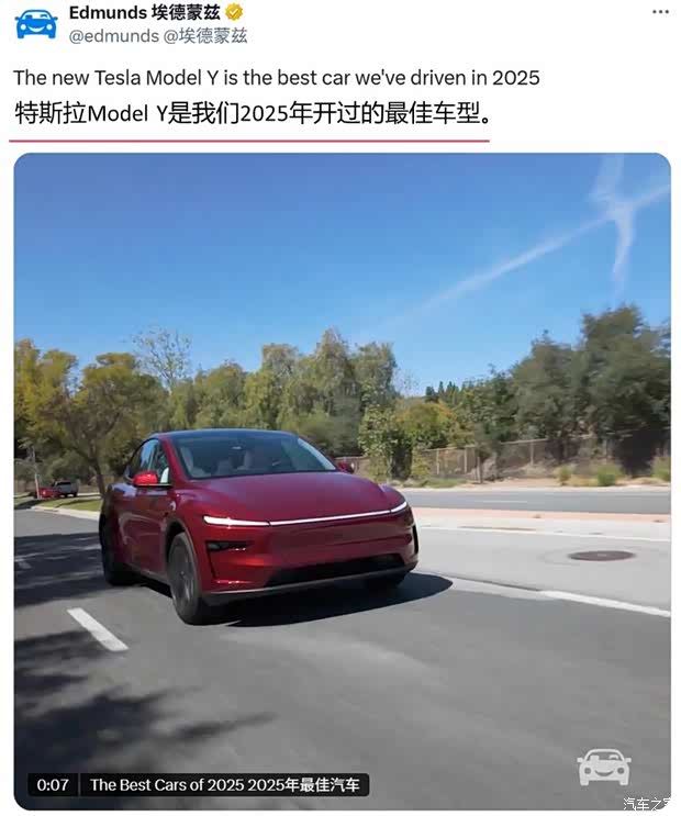 🏅这份销量成绩的背后,是Model Y过硬的产品实力。权威汽车评测机构Edmunds对200多款乘用车展开综合测评后,将Model Y评为“2025年最佳车型”,认可了它在安全、智能、性能与空间等多个维度的表现。不少车主也在社交平台分享驾驶体验,有车主驾驶Model Y在德国高速开到190公里/小时,依旧觉得车辆静谧又稳健,刹车响应也十分迅速,安全感拉满。