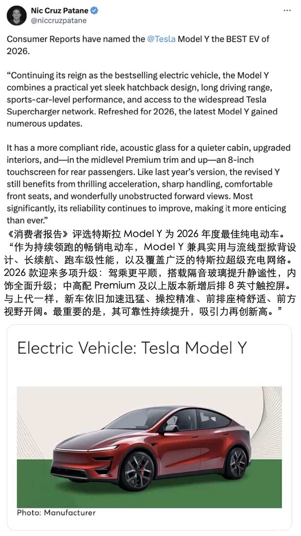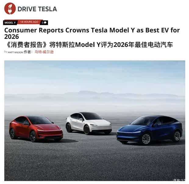 权威消费测评机构《消费者报告》发布2026年度“最佳车型”榜。在覆盖全市场的激烈评选中,特斯拉Model Y是唯此一例获得品类桂冠的纯电车型,被评为 “年度最佳电动车”。