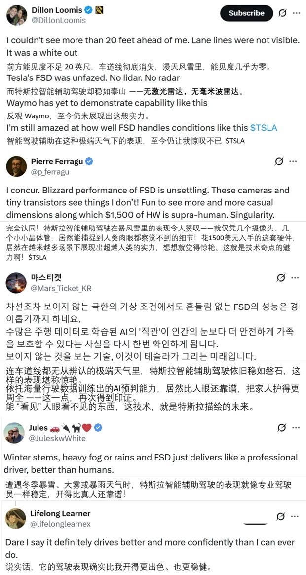 海外网友实拍视频引发热议:大雪纷飞的极端路况下❄,前方能见度不足6米,车道线被积雪完全覆盖,特斯拉智能辅助驾驶却能稳稳前行,全程从容顺畅🚙。这套无需激光雷达、仅靠摄像头的系统,能捕捉到人类肉眼难以察觉的细节,即便在未清理的积雪陡坡,搭配冬季轮胎也能平稳下坡。