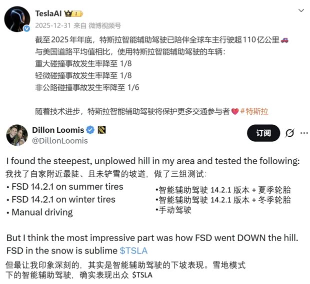官方数据显示,截至2025年底,特斯拉智能辅助驾驶已陪伴全球车主行驶超110亿公里,重大事故发生率仅为美国道路平均值的1/8,轻微事故和非公路事故发生率也大幅低于平均水平,展现出超越人类驾驶的安全性。