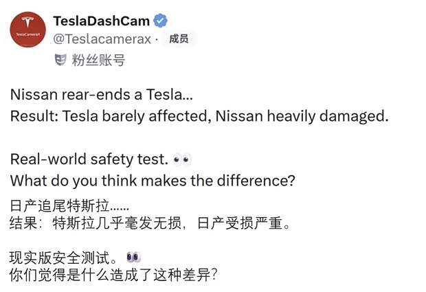 从海外日产追尾到国内车主实测,特斯拉均实现车身微损,对比燃油车的严重损毁,用现实案例印证纯电安全硬实力。