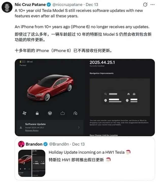 传统燃油车功能固化,加装“驻车盲点警报”等配置成本高昂,且无法实现软件级安全优化。而特斯拉通过全栈自研系统,实现像手机一样的流畅更新。