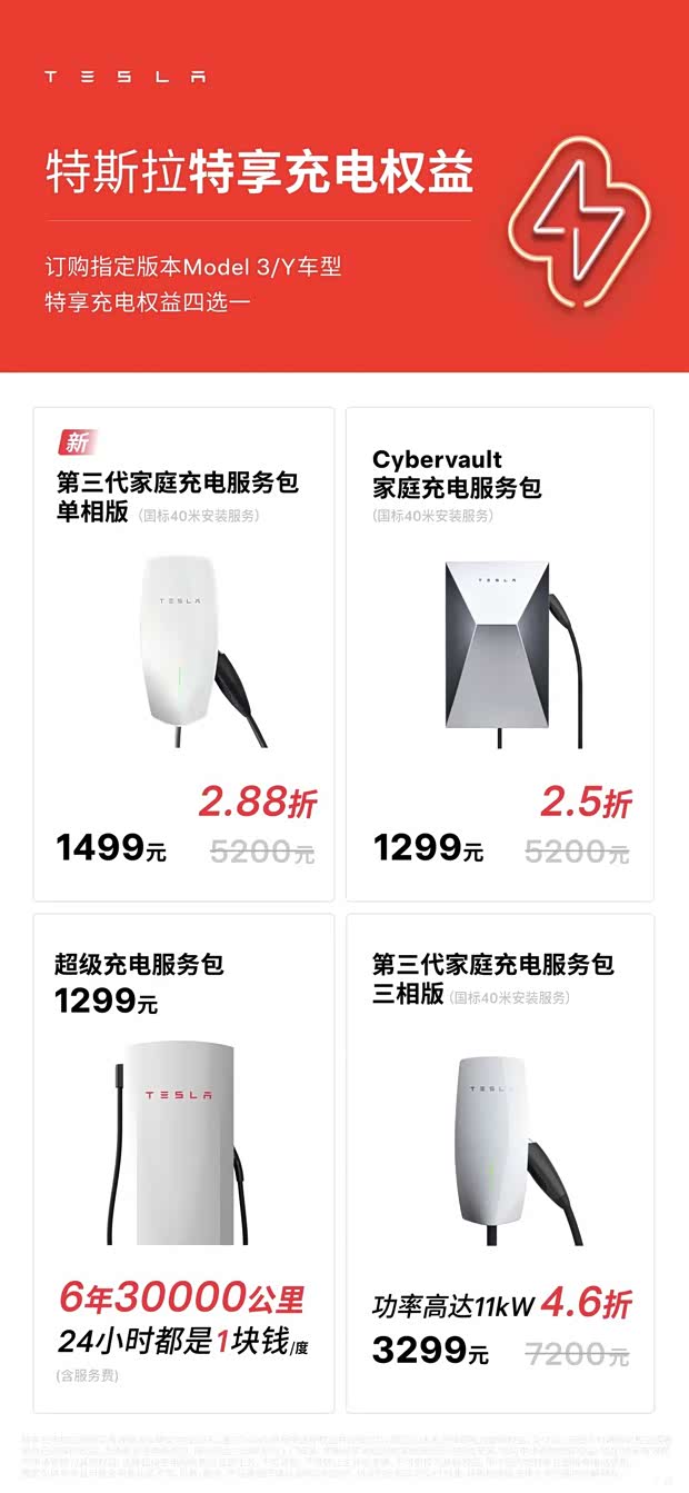 3月3日,特斯拉更新“购车即享”权益,新增单相版家充服务包,购车用户以1499元申领包含充电桩及40米内标准安装的服务,帮助用户根据充电场景选择组合。