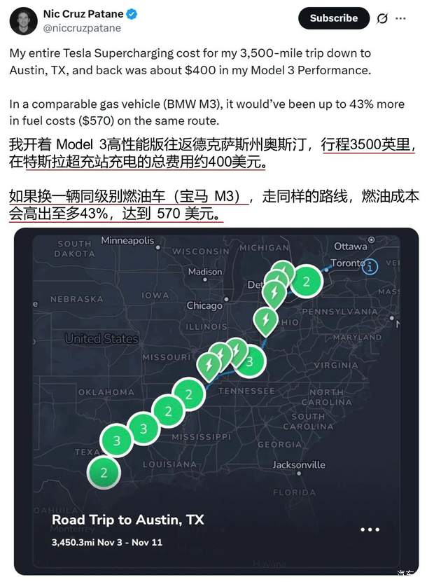 特斯拉车主:省下的钱够买一台 iPhone 16 Pro 了😂一、5600 公里实测:充电 VS 加油,差价惊人海外博主 @niccruzpatane 最近干了件猛事:开着特斯拉 Model 3 高性能版,往返美国得州奥斯汀,全程 5600 多公里。全程用特斯拉超充站充电,电费总共 2843 元。作为对比,同级别的BMW M3 跑同样路线,油费要 4052 元 ——Model 3 的补能成本只有BMW M3 的 70%!这还不是最夸张的。有 Model 3 高性能版车主跑了 38 万公里后算账:充电电费比加油省了 45 万元(油车同等里程需多花 47 次机油保养费)。难怪网友调侃:“开特斯拉省下的钱,够给全家换最新款苹果全家桶了”🍎