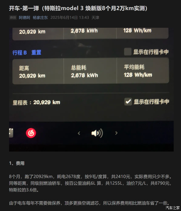 8 个月 2 万公里实测:Model 3 续航跑赢表显,成本仅为油车 1/3!