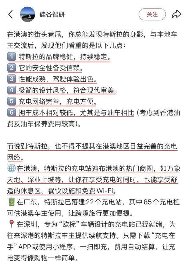 特斯拉在香港的热销,源于产品与市场的高度契合。本地车主表示,特斯拉品牌稳健、安全性备受信赖,极简设计符合现代审美,再加上香港完善的充电网络——超级充电站遍布万象天地等热门商圈,配套休息区、餐饮设施和免费Wi-Fi,让补能变得便捷又舒适。同时,跨境充电也无需担忧,广东已建成22个充电站,85个充电桩可供港澳车主使用,极大提升了用车便利性。