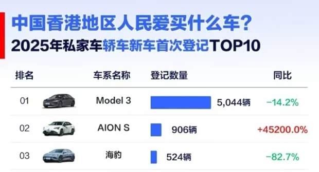 最新数据显示,2025年中国香港地区私家轿车新车首次登记榜单中,特斯拉Model 3以5,044辆的成绩稳居榜首,成为当地最畅销的私家轿车,销量更是高达第二名的5.6倍,实力领跑市场。