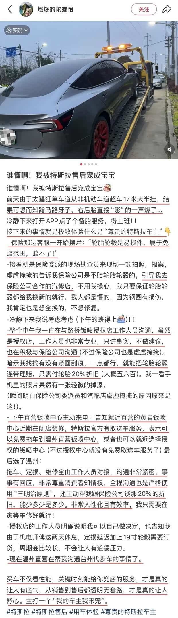 不少特斯拉车主在分享用车经历时都提到了贴心的售后服务,有车主遇到车辆爆胎的突发状况后,官方售后迅速提供免费拖车服务,同时协助车主对接保险理赔,全程帮忙沟通处理,还尽力争取减免相关折旧费用,甚至为车主提供代步车使用,整个流程高效又省心👍。