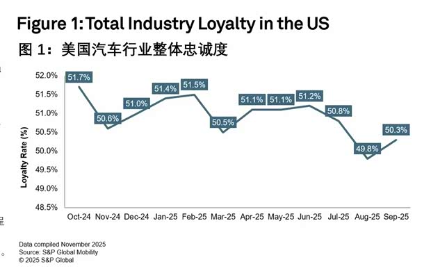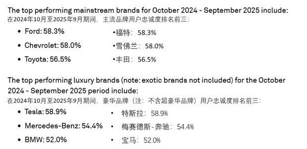 这份业内唯此一例纯数据驱动的奖项,基于2024年10月至2025年9月全美1360万份新车零售上牌数据,通过家庭增换购行为分析得出。数据显示,特斯拉用户忠诚度高达58.9%,不仅连续四年领跑豪华车市场,远超Benz(54.4%)、BMW(52.0%)等传统豪强,更高于行业均值,成为车主“增换购首选”。