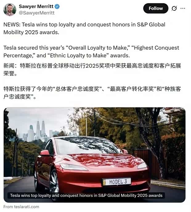近日,标普全球(S&P Global)公布2025年度品牌用户忠诚度排名,特斯拉凭借硬核实力包揽“总体客户忠诚度”“最高客户转化率”“少数族裔市场用户忠诚度”三大奖项,成为唯此一例斩获多奖的乘用车品牌,尽显全球用户认可度。