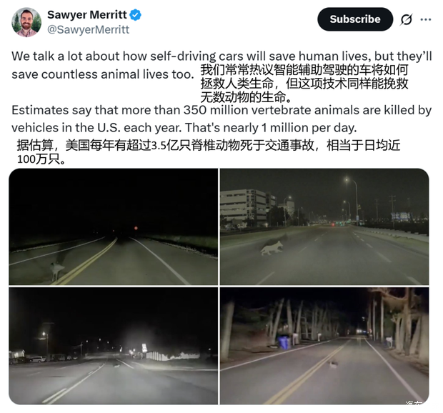 • 减少动物伤亡:美国每年有超过3.5亿只动物因交通事故死亡。特斯拉的避险能力直接降低了这类悲剧的发生概率。