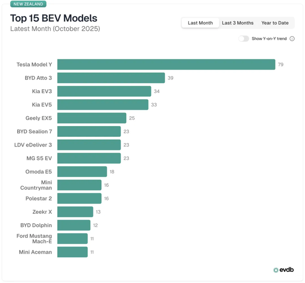 特斯拉在新西兰火爆了,累计交付量轻松突破 2 万辆!🚀据 EVDb 数据,10 月纯电动车销量榜上,Model Y 稳坐冠军宝座,领先对手一大截,简直是当地电动车界的扛把子!
