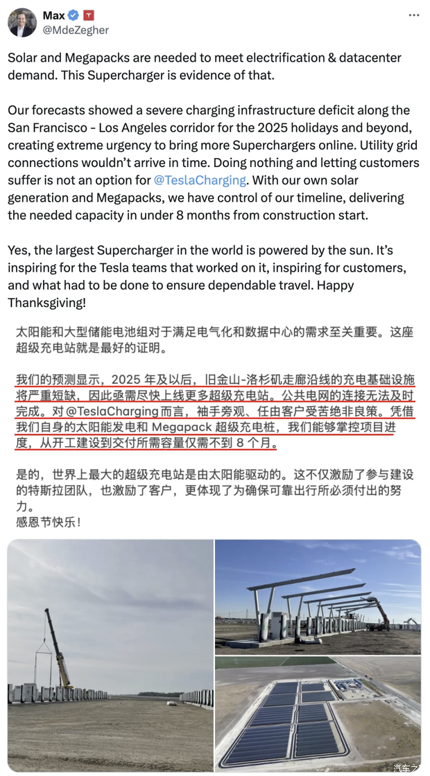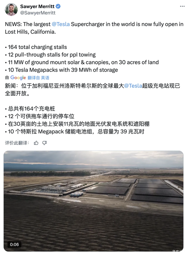 今年 7 月首批 84 桩就开张,现在全站完工,全靠 11MW 太阳能板发电 + 10 组 Megapack(39MWh 储能)自给自足,彻底摆脱电网!从开工到交付,仅 8 个月超速建成,日常 100% 阳光充电,超级环保🔥。