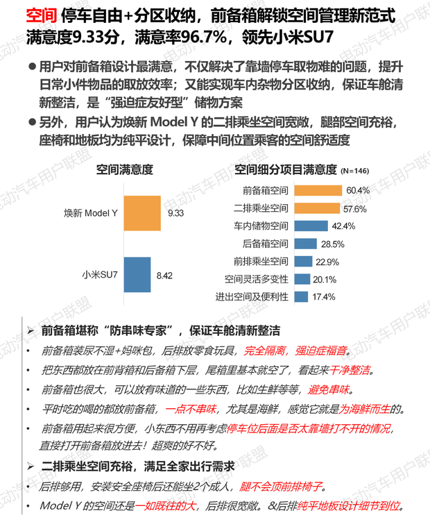 实测数据更亮眼:空间满意度9.33分,96.7%车主点赞!6成人pick前备箱,山姆采购、靠墙停车超方便,尿不湿与零食分区放,强迫症狂喜;二排纯平设计,装安全座椅还能坐2成人。