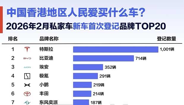 2026年2月中国香港私家车市场的销量榜单新鲜出炉,特斯拉凭借1001辆的登记数量稳居品牌销量榜首,远超第二名的BYD。