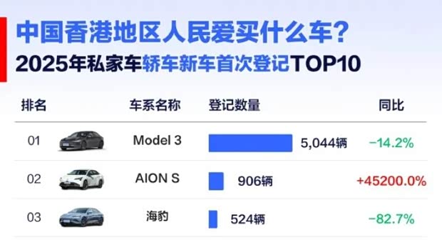 其实特斯拉在香港市场的热销早已成为常态,在2025年香港私家车轿车新车首次登记榜单中,特斯拉Model 3就稳居榜首,年度登记数量达到5044辆,是第二名的5.6倍,即便有14.2%的同比下滑,依旧保持着很大的领先优势。