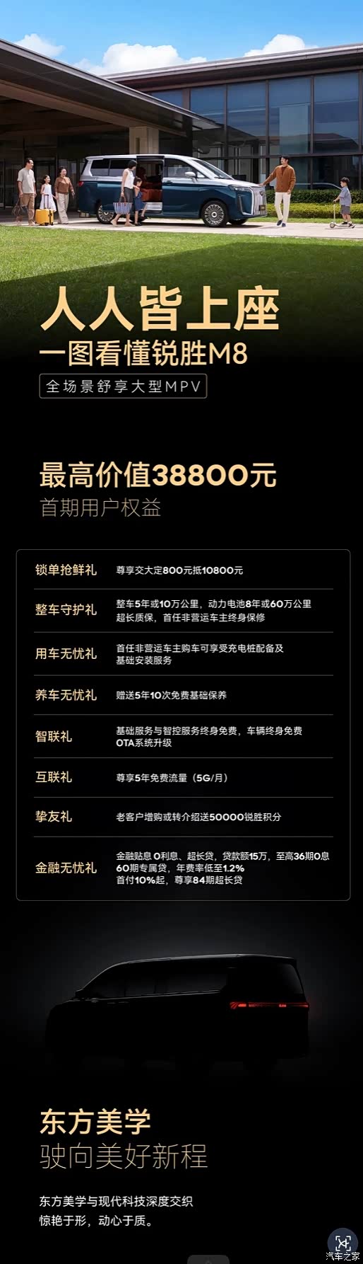 锐胜M8不仅让大型豪华MPV买的轻松,更加让客户用的放心。为了回馈首批客户,开启限时2000台的超级购车权益。