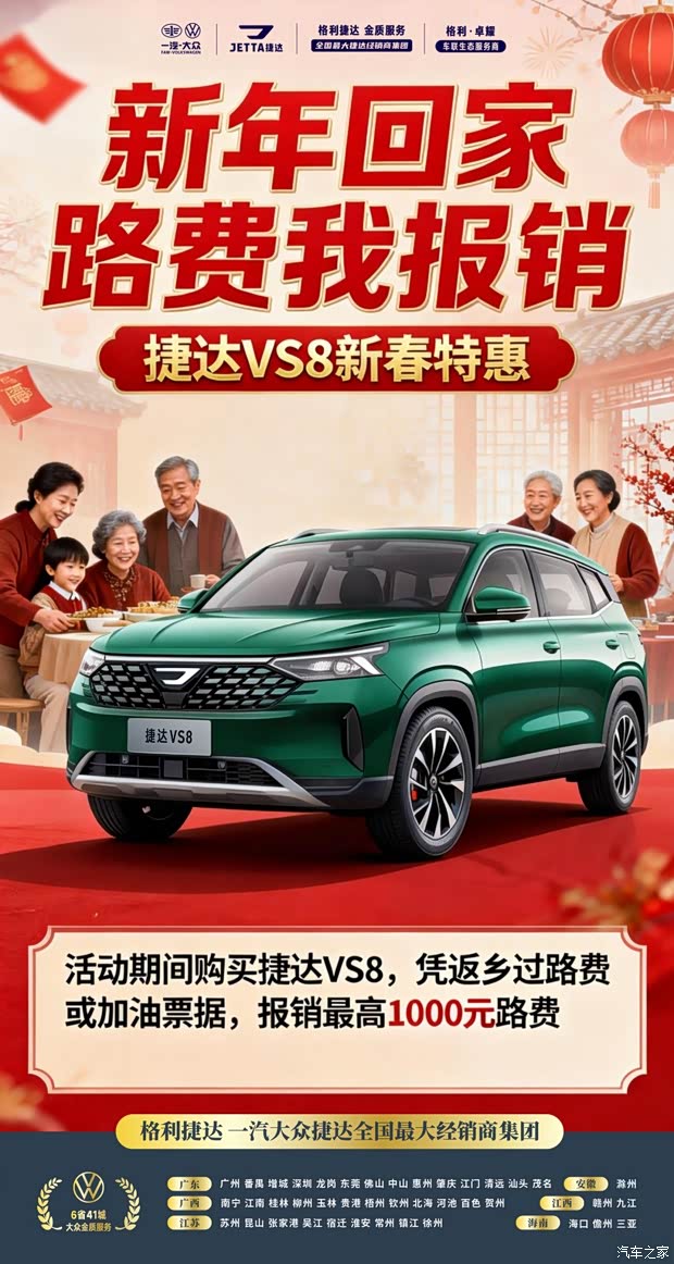 活动期间购买捷达VS8,凭返乡过路费或加油票据,即可报销最高1000元路费!高速费、加油费,我们来买单。德系品质,空间宽敞,油耗经济,捷达VS8伴您舒心返乡、省心出行。限时福利,名额有限,快带上票据来店试驾,让回家之路更轻松!
