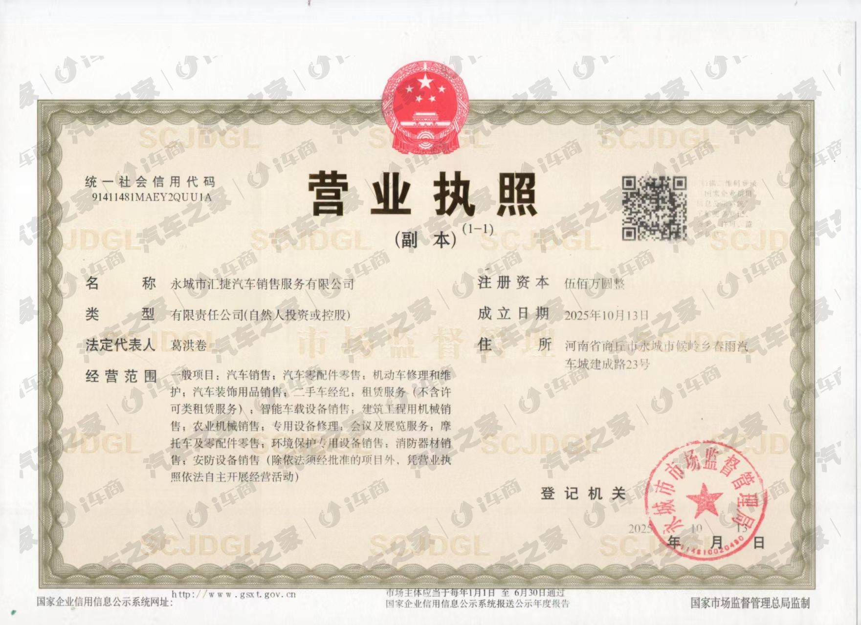 永城市汇捷汽车销售服务有限公司:汽车销售;汽车零配件零售;机动车修理和维护;汽车装饰用品销售;二手车经纪;租赁服务(不含许可类租赁服务);智能车载设备销售;建筑工程用机械销售;农业机械销售;专用设备修理;会议及展览服务;摩托车及零配件零售;环境保护专用设备销售;消防器材销售;安防设备销售(除依法须经批准的项目外,凭营业执照依法自主开展经营活动)