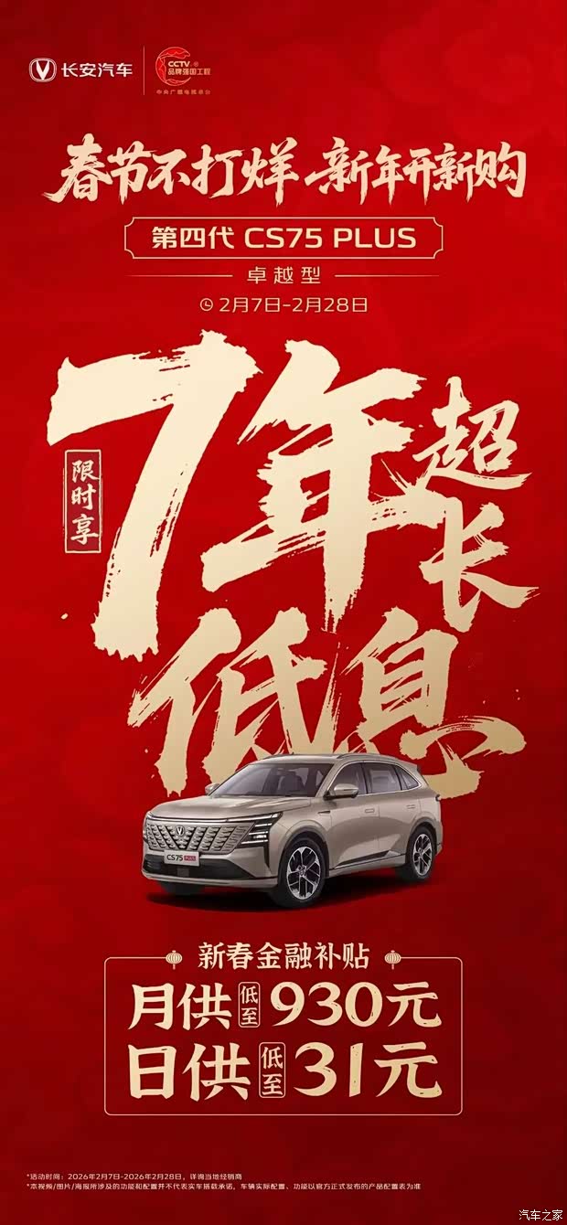 2 月 7 日 - 2 月 28 日,第四代 CS75PLUS 卓越型限时开启新春金融礼遇:7 年超长低息政策暖心上线,月供低至 930 元,日供仅 31 元,以轻松姿态,拥享大空间品质座驾。