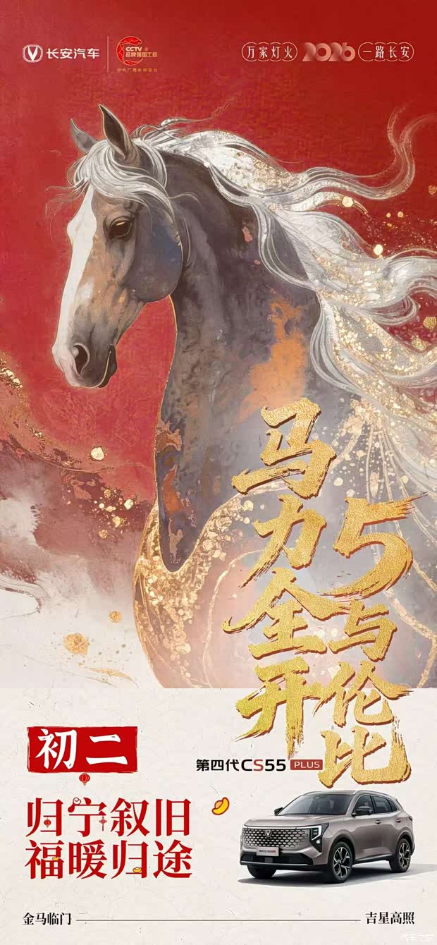 2026丙午马年,长安汽车借势生肖文化与春节民俗,推出第四代CS55PLUS新春营销海报。海报以红金为主色调,水墨质感的骏马形象气势磅礴,既呼应马年新春的时间节点,又以“马力全开 5与伦比”的创意文案,一语双关地关联车型“55”的标识与强劲产品力。“初二”的时间标注与“归宁叙旧,福暖归途”的文案,精准锚定正月初二回娘家的传统习俗,切中家庭出行的核心需求。硬朗的车身设计与喜庆的新春氛围相得益彰,辅以“CCTV品牌强国工程”背书及“万家灯火 一路长安”的品牌口号,既强化了品牌公信力,又将车型与“平安归家”的春节核心情感深度绑定,成功塑造出春节走亲访友的理想出行伙伴形象。