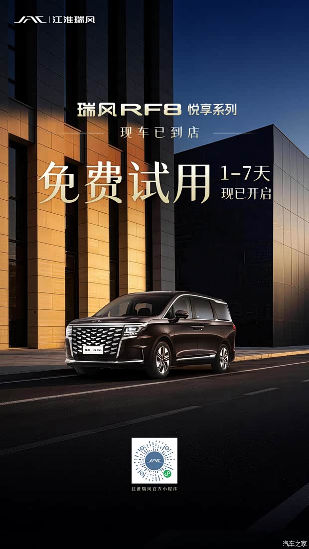 即日起,前往瑞风RF8悦享系列授权门店,即可申请免费试用!