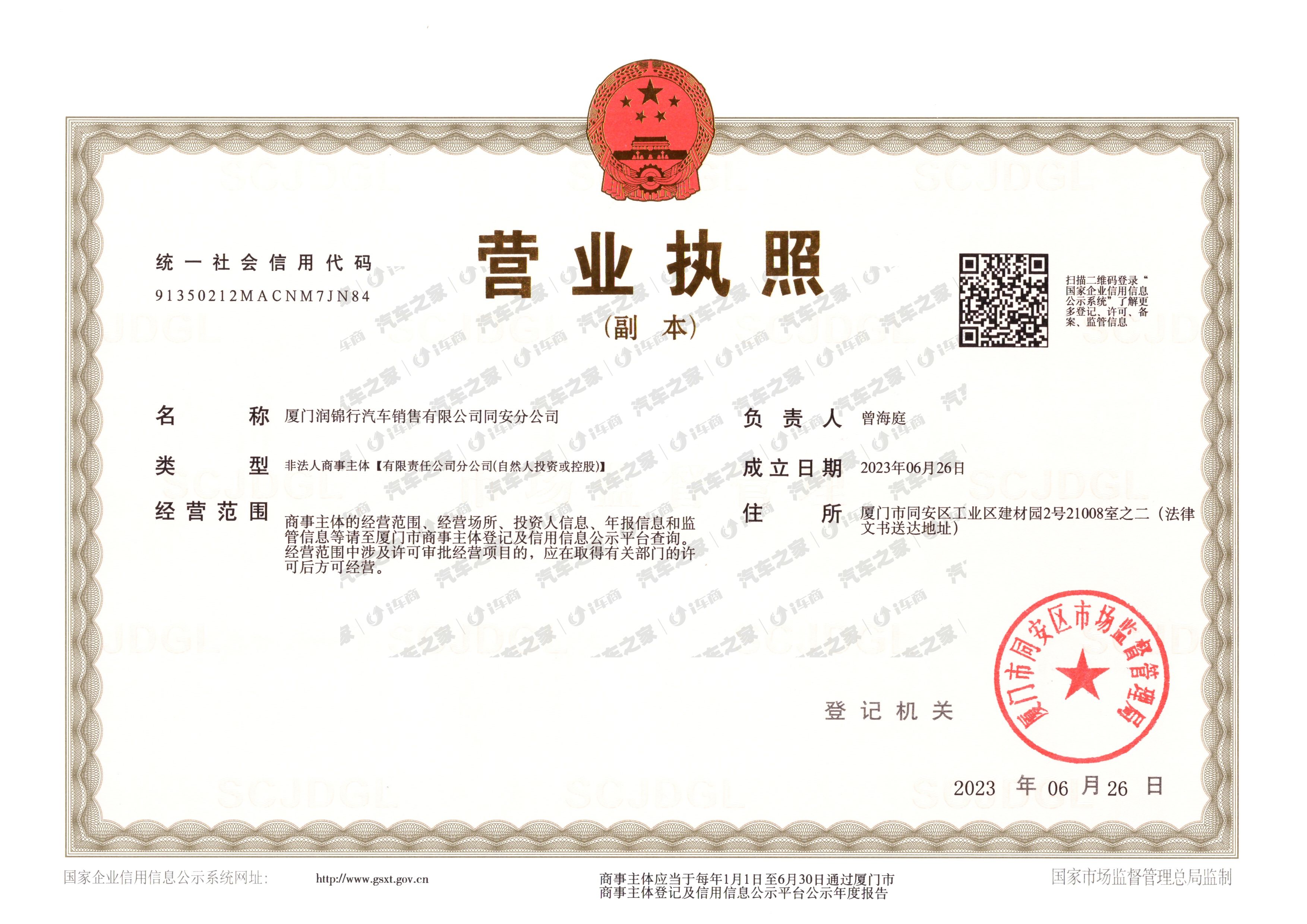 厦门润锦行汽车销售有限公司同安分公司