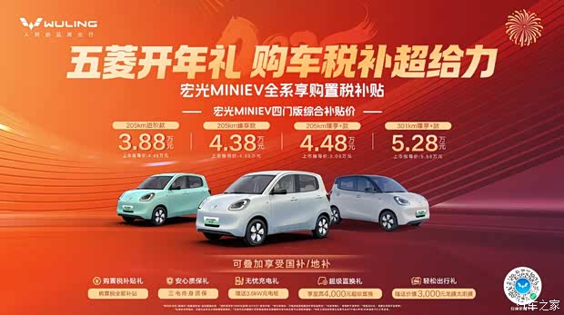 宏光MINIEV四门版共推出进阶款、臻享款和臻享+款、301km臻享+款四个配置,官方指导价4.48万-5.58万元!为广大用户提供代步2.0时代的新选择!此后广大用户可通过“五菱汽车”官方渠道下订。凡进店购车用户可享多重福利,诚意满满: