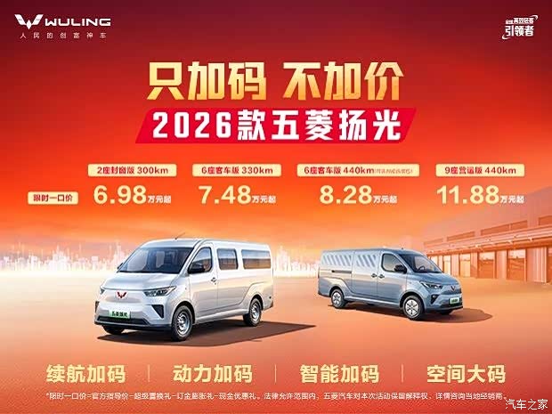 2026年2月24日,连续22个月蝉联细分市场的五菱扬光家族正式焕新,2026款车型正式开启预售,完成了续航、动力、智能三大维度的全面升级,同时延续了“只加码不加价”的定价策略。