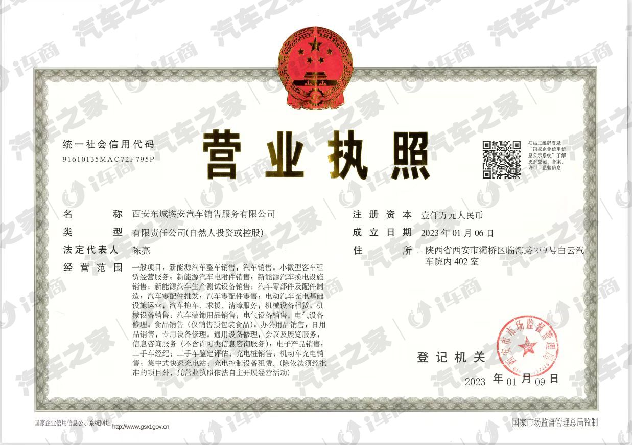 我公司位于西安市灞桥区东三环与南三环交汇处(月登阁桥下)东城高端汽车主题公园 白云汽车销售集团七楼,拥有2000 ㎡宽敞明亮的现代化展厅,销售广汽埃安旗下的 AJON i60 , AION RT, AION V Home, AION UT, AION UTSuper 在售五款车型。有1500 ㎡设备完善的售后服务维修车间,还有备件充足的零部件仓库及环境舒适的客户休息区及VIP专享接待室。