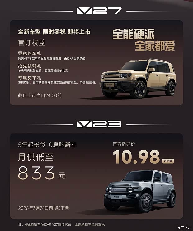 V27盲订活动持续至上市当日24时(具体以iCAR汽车APP为准)。支付2000元参与金,即可锁定品牌全额承担购置税的“零税购车礼”,以及抢先试驾礼、价值3000元的交车礼包。对于家庭用户而言,这笔节省下的购置税(约1.5万-2万元),足够为爱车添置全套户外装备或升级家庭影音设备。