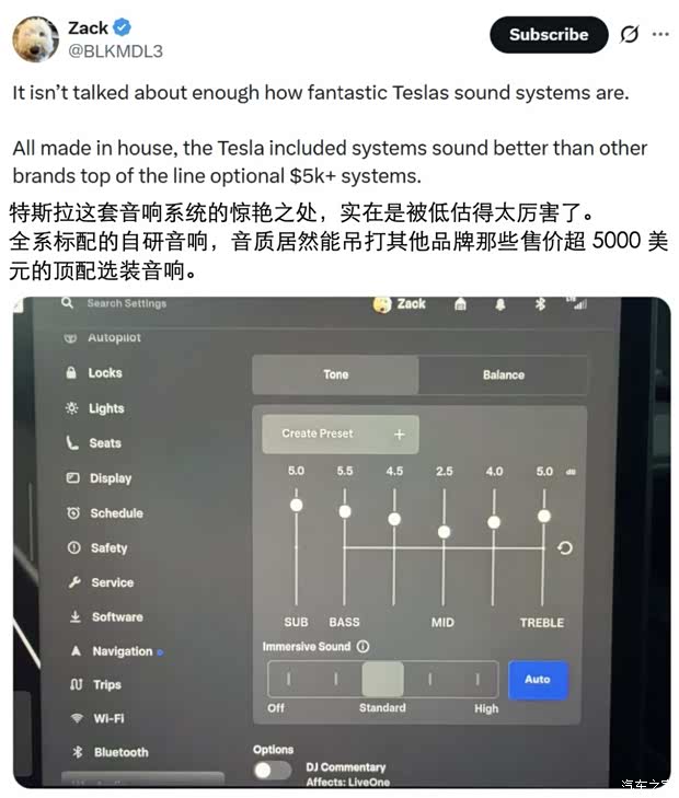 更硬核的是,连专业音乐人在完成母带制作前,都会先到自己的特斯拉里试听一遍。他们认为其各频段扎实、细节清晰,平衡感极优。