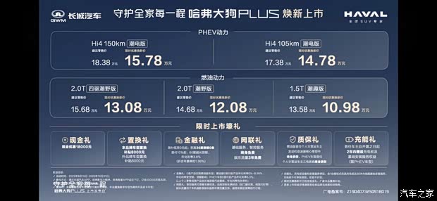 哈弗大狗PLUS PHEV焕新上市,配备第二代Hi4智能四驱电混技术,增配不加价,现在购车可享18000元现金优惠,更有至高8000元置换补贴,另享金融礼、网联礼、质保礼、充能礼多重壕礼: