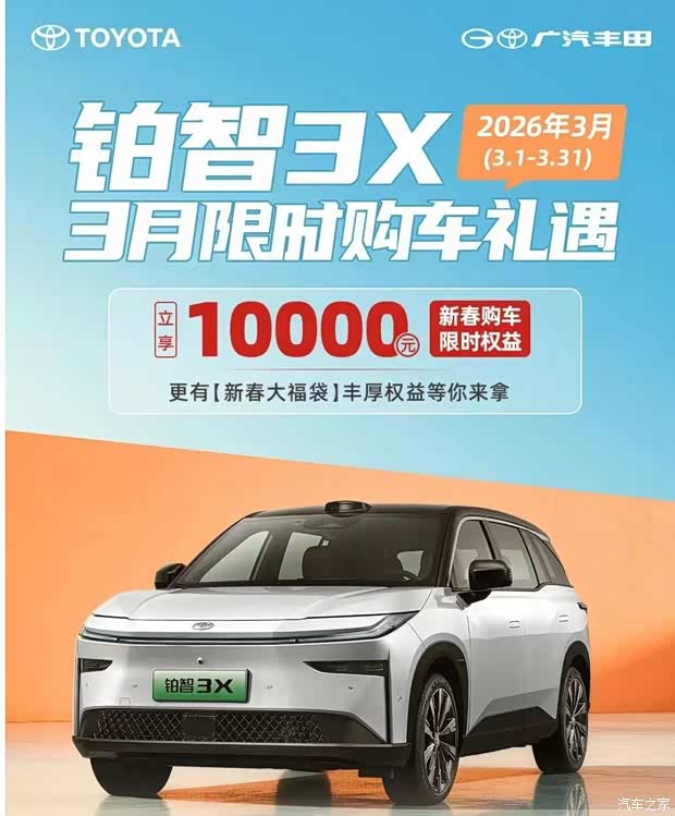 春风送暖,万物焕新,正是开启美好出行的好时节。2026年3月1日至3月31日,广汽丰田铂智3X携重磅购车福利登场,以十五重礼遇致敬每一位追求品质与智能的消费者,让你轻松解锁纯电出行新体验。