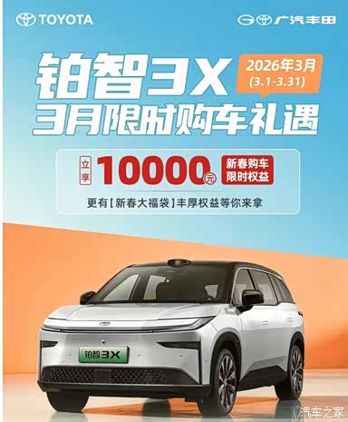 作为广汽丰田旗下的智能纯电SUV,铂智3X凭借前瞻的设计理念、可靠的电动技术与贴心的智能配置,成为家庭出行与城市通勤的优选。而在这个三月,它更以“立享10000元新春购车限时权益”为起点,搭配【新春大福袋】三重豪礼,让购车门槛大幅降低,让每一份出行期待都能轻松落地。
