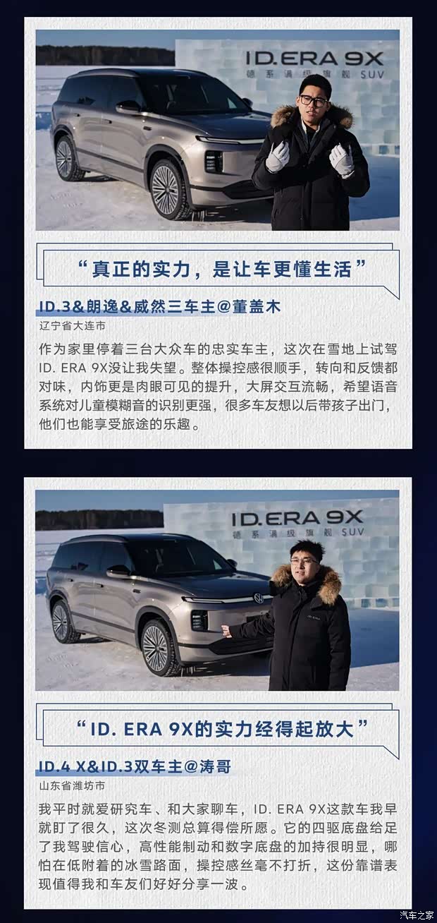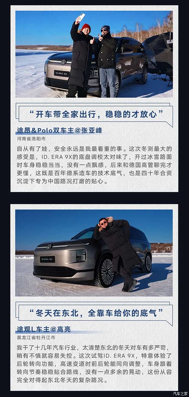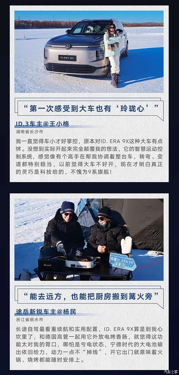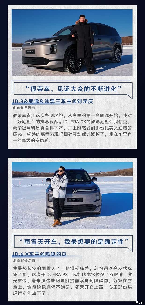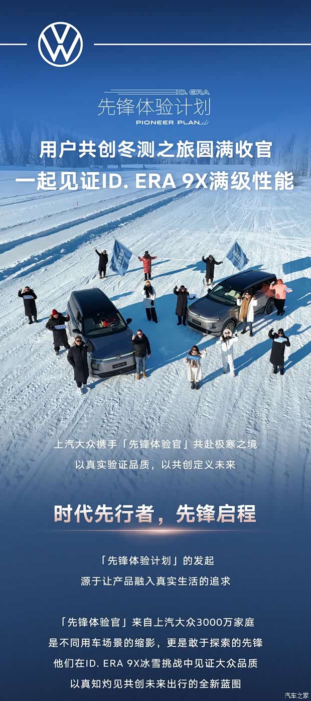 上汽大众携手「先锋体验官」共赴极寒之境以真实验证品质,以共创定义未来 时代先行者,先锋启程 「先锋体验计划」的发起 源于让产品融入真实生活的追求 「先锋体验官」来自上汽大众3000万家庭是不同用车场景的缩影,更是敢于探索的先锋他们在ID.ERA 9X冰雪挑战中见证大众品质以真知灼见共创未来出行的全新蓝图