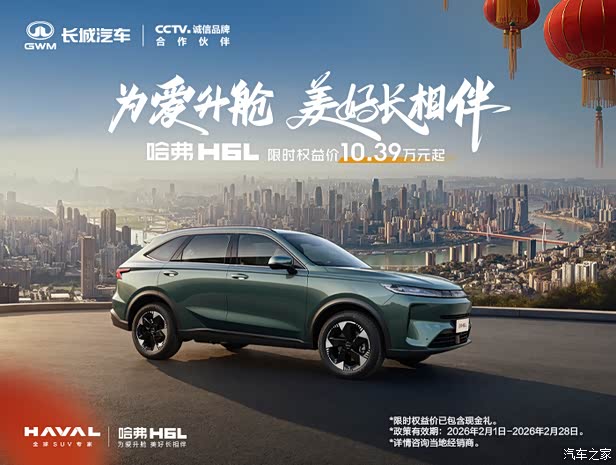 为爱升舱越级而来,哈弗H6L重磅上市,自然律动美学设计天生就美;搭载Coffee OS 3智能座舱,应用生态更丰富,语音响应更速度;14.6英寸智慧中控屏清晰度更高、操控更流畅;高配车型搭载2.0T+9DCT动力组合更省更爽,WLTC百公里油耗仅7.4升,零百加速仅需7.4秒;前车窗静音玻璃,多功能双密度工学座椅。为爱升舱,舒享每一程。现在购车,享限时优惠价10.39万元起。
