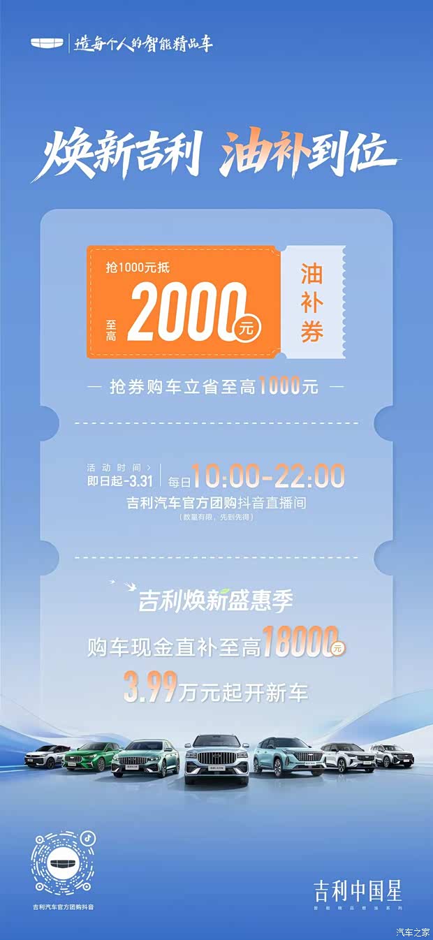 焕新吉利油补到位,抢1000元抵至高2000元油补券