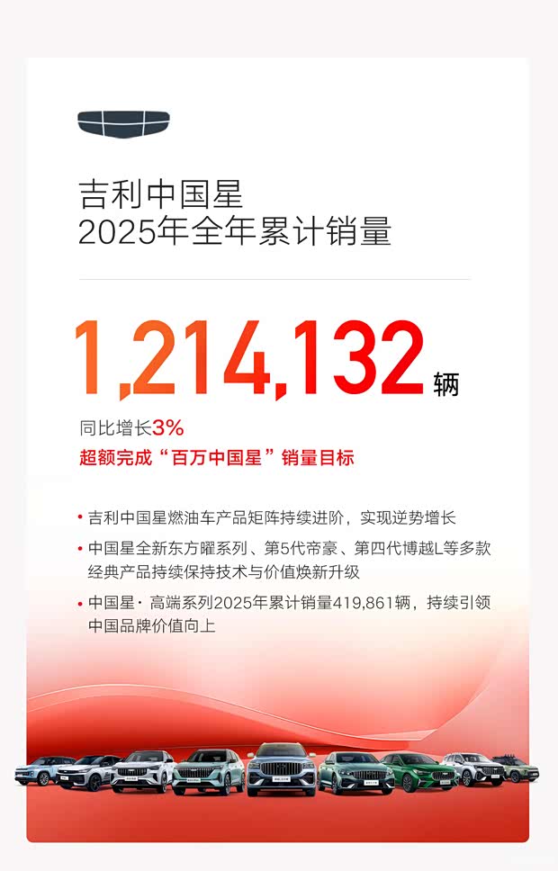 荣耀收官!吉利汽车2025年全年累计销量超302万辆